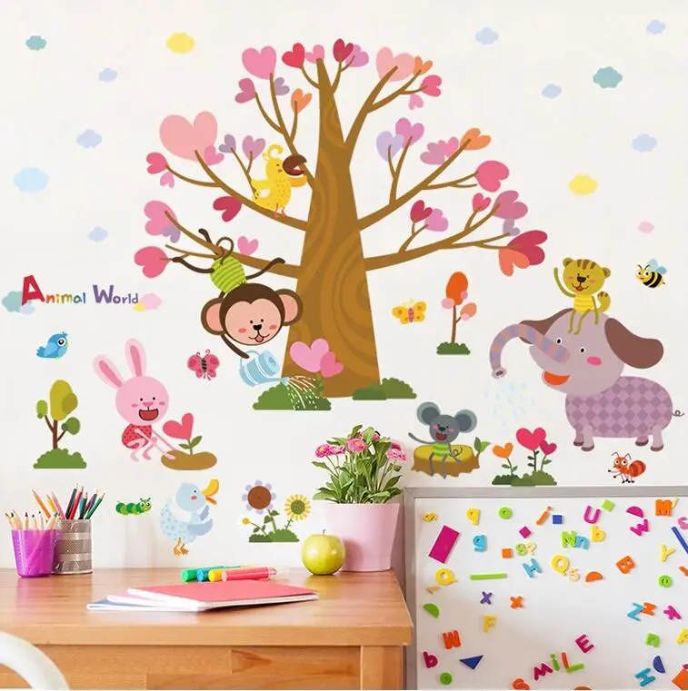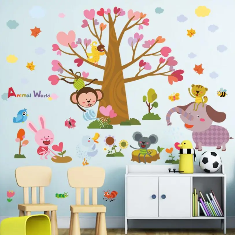 Heart Tree Wall Sticker Tree Jungle Animals Wall Stickers For Kids Rooms Baby Nursery Zoo Wall Deca